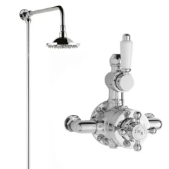 The Hudson Reed Topaz Shower Rose and Rigid Riser Kit is a traditional thermostatic shower package. It includes a generously sized fixed shower head as well as a practical handheld shower head and a built in diverter, all finished in gleaming chrome. The exposed shower valve and easy grip ceramic handles give it a classic Victorian style that makes it both robust and elegant. Handy features include an anti scald device for your safety and patented cartridge technology that reduces limescale for a shower that’s built to last and keep sparkling for years to come.